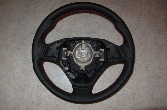 Verkaufe ein Lederlenkrad mit roten Nähten.
