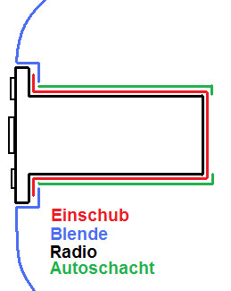Also Rahmen drauf, Einschub rein und im Schacht die Ecken umbiegen. Dann Radio anschließen, ausprobieren und wenn´s geht das Radio reinschieben bis es klickt.