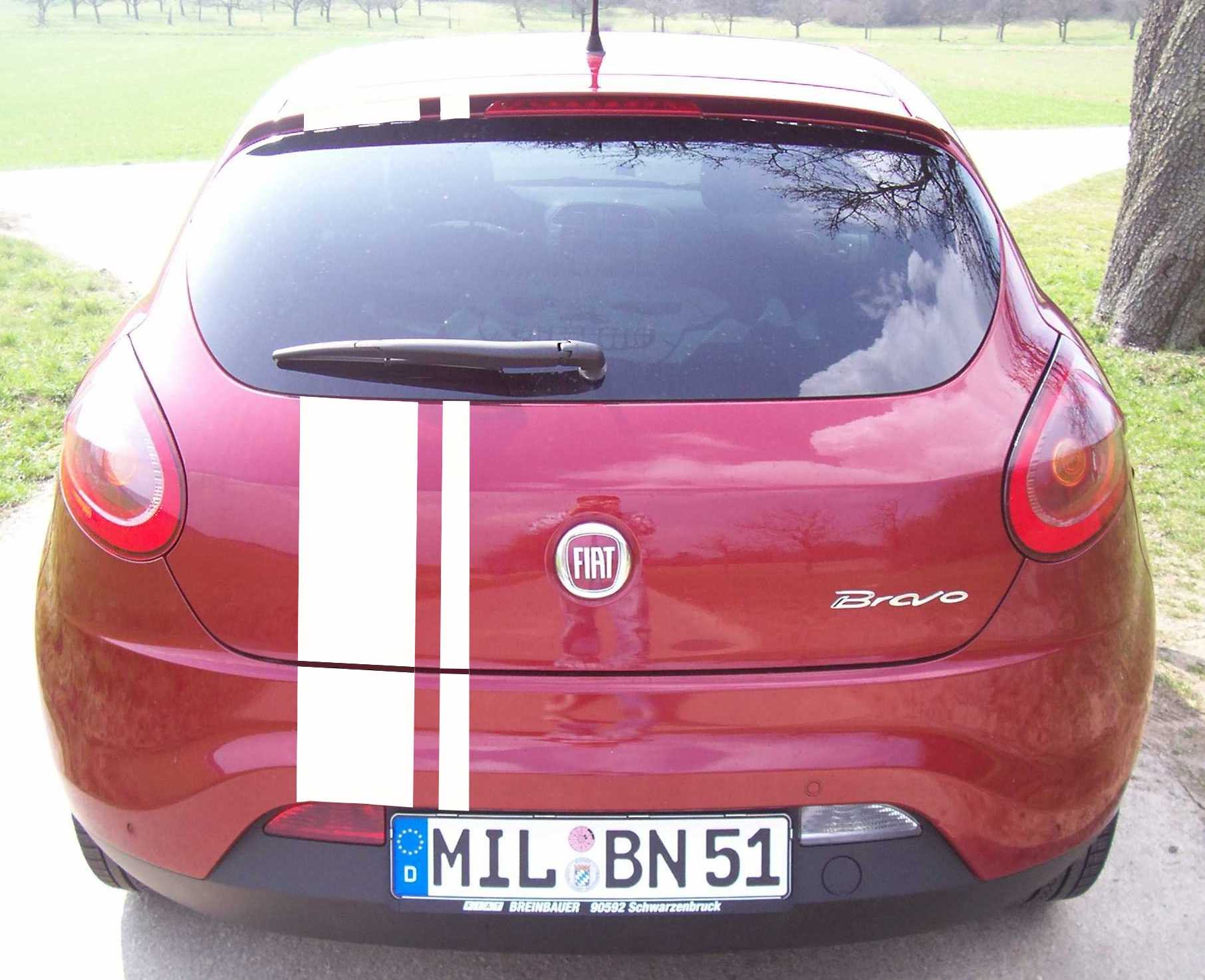 .. aber bin mir noch nicht sicher was genau. Was sicher ist: Es sollten Streifen sein, die der Front zum Heck laufen, und zwar in schwarz (eventuell mit kleinem weißen rand). Nur wie genau weiß ich noch nocht. Entweder 2 breitere Streifen mittig, oder rechts oder links versetzt dann einen schmaleren. Sollte aber wenn schon von der Frontschürze (Unterkante) bis zur Heckschürze gehen (die scheiben natürlich nicht).
