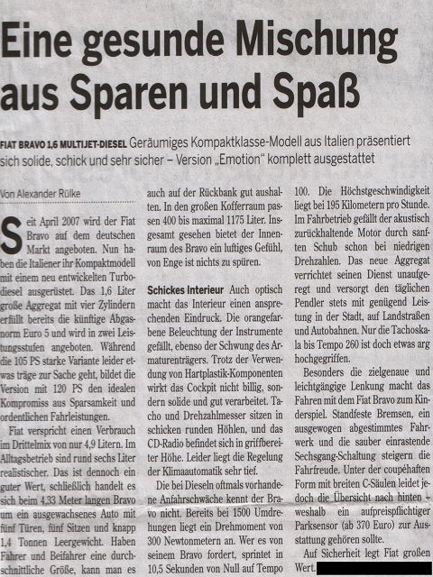 für alle Interessenten, ich lese "Auto & Stassenverkehr". Da ist für die nächste Ausgabe auch ein Bravotest angesagt. Wurde als Dauertest mit 70000km avisiert. Mal sehen was rauskommt. Generell ist es so das Autos ausländischer Hersteller mies gemacht werden, nicht nur FIAT.